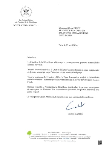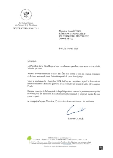 Le 23 avril 2026, je reçois une réponse à ma lettre adressée le 6 avril dernier à Mr Émmanuel Macron, Président de la République.